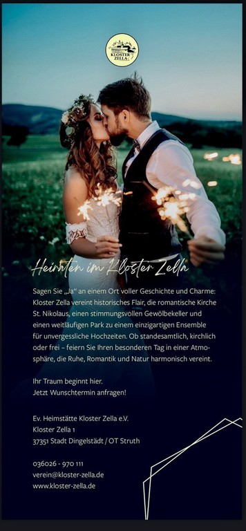 Kloster Zella bietet eine wunderbare Kulisse für zukünftige Hochzeiten, sei es im Standesamt oder in der Kirche. Das malerische Ambiente des Klosters verleiht jeder Zeremonie eine besondere Atmosphäre. Paare können den Bund fürs Leben vor historischer Kulisse schließen, ganz gleich ob eine standesamtliche Trauung oder eine kirchliche Hochzeit - Kloster Zella schafft den perfekten Rahmen für einen unvergesslichen Tag.